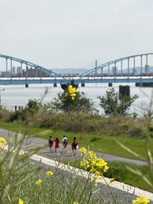 1年生全員に加え、2・3年生の希望者も参加し、春の河川敷をにぎやかに歩きました。